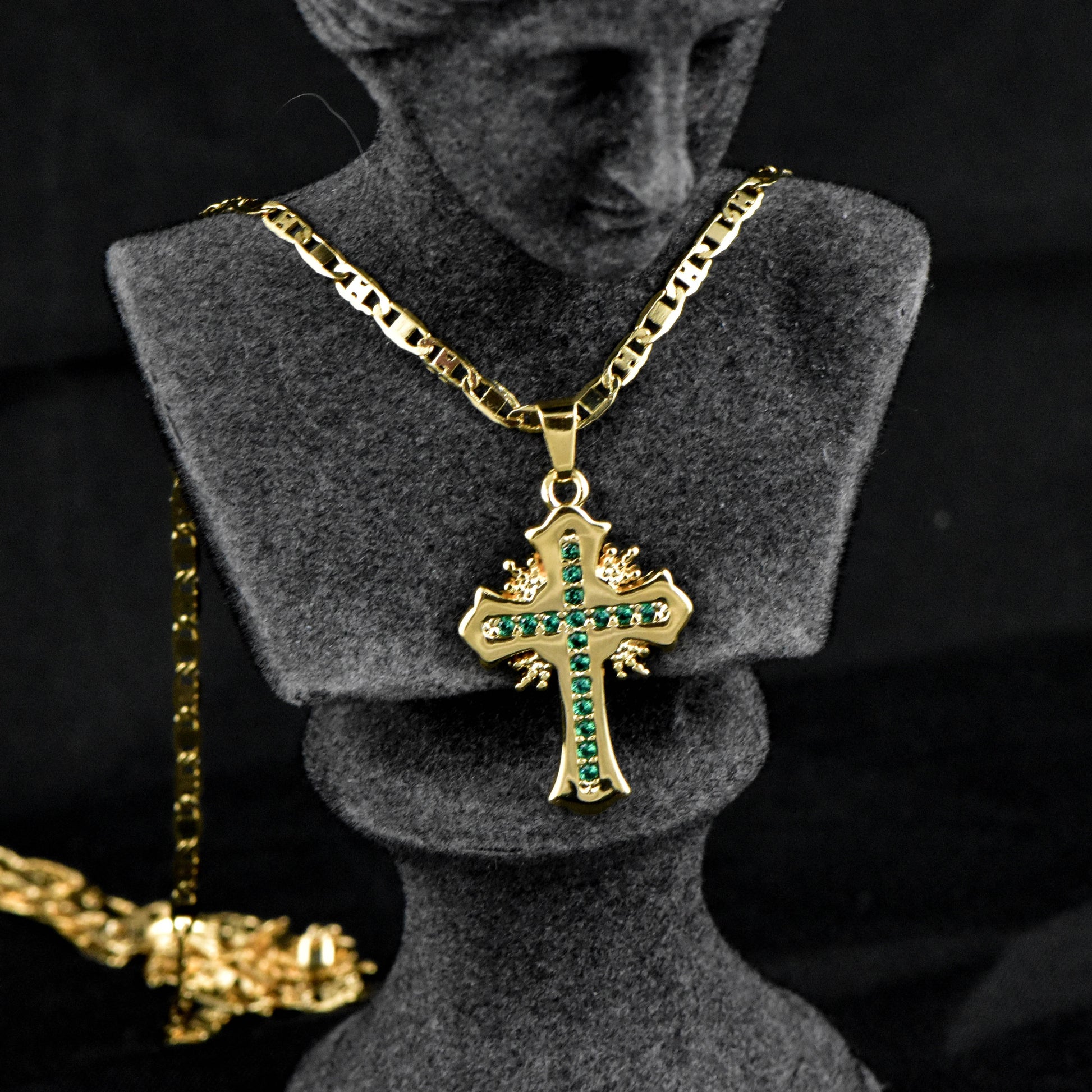 Cadena Cubana Plana en H 65cm + Colgante Cruz Sagrada Circonia Verde